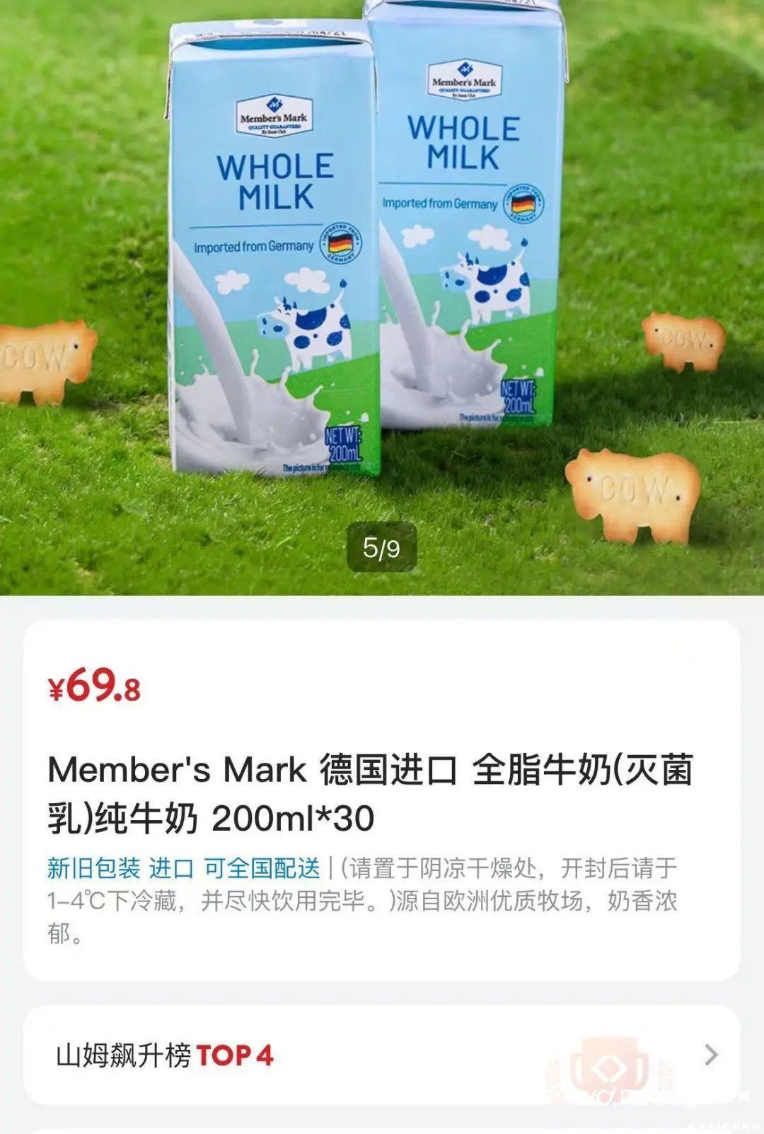 山姆APP显示,此次的涉事商品是山姆自有品牌的全脂牛奶,宣称德国进口,为“山姆飙升榜第四名”。在山姆APP上,30瓶200mL的产品售价69.8元,平均每瓶牛奶售价2.33元。
